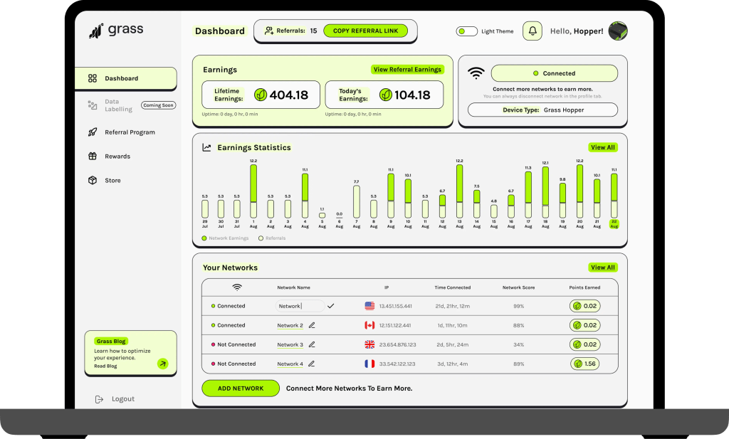 Grass là một dự án Depin ,giao thức hoạt động trong mảng khai thác dữ liệu web (web scraping), cho phép người dùng kiếm lợi nhuận thụ động bằng cách chia sẻ băng thông cho các công ty phát triển công nghệ AI.