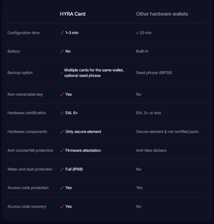 A Hyra wallet set can hold up to three Hyra chip cards. You’ll receive three identical cards for one wallet, similar to having three matching keys for your digital wallet.