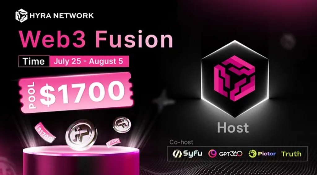 Hyra Network rất vui mừng được đồng tổ chức với bốn đối tác uy tín để khởi động: WEB3 FUSION — một chiến dịch cộng đồng quy mô lớn được xây dựng để kết nối, tiếp thêm năng lượng và phát triển các hệ sinh thái năng động nhất trong không gian Web3.