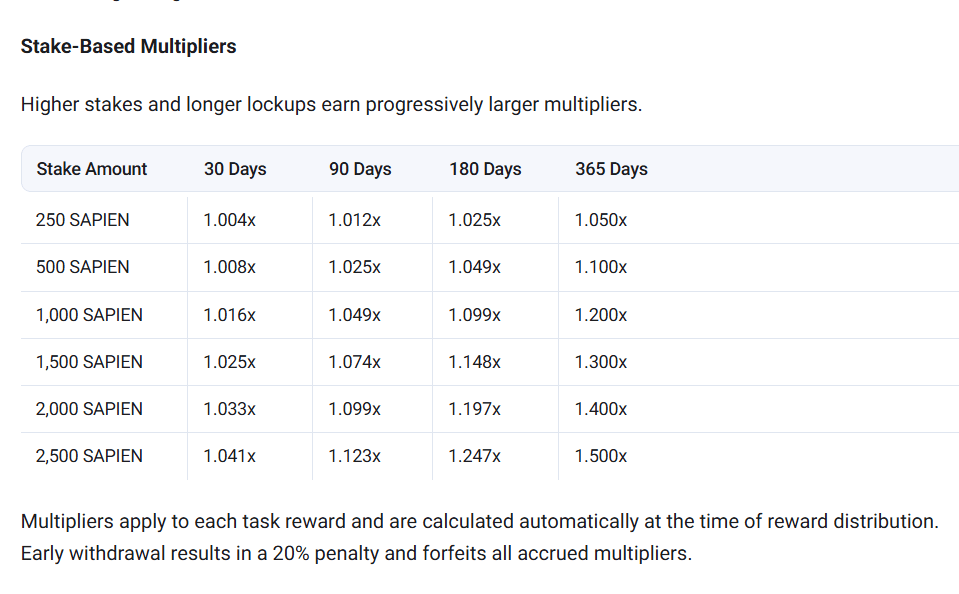 Staking trên Sapien là chìa khóa để gia tăng hiệu quả và tốc độ thu nhập. Trước khi bắt đầu các nhiệm vụ thuộc hệ sinh thái data-AI, người tham gia phải stake token SAPIEN làm cọc (collateral), tạo động lực để đảm bảo chất lượng công việc.